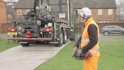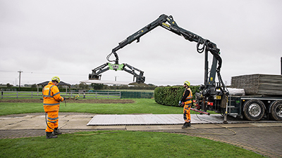 Traditionally, drivers would need to climb in and out of the cab dozens of times each day as they positioned vehicles for trackway deployment. The new remote-control system -supported by an array of cameras and sensors – allows the operator to stand at the rear of the truck with a clear view of the work area, dramatically reducing fatigue and the risk of trip-and-fall injuries while drastically increasing productivity. Built-in safety features, including speed limits and proximity detectors, reduce the chance of collisions or ground damage, vital on-sites with sensitive surfaces or constrained access.